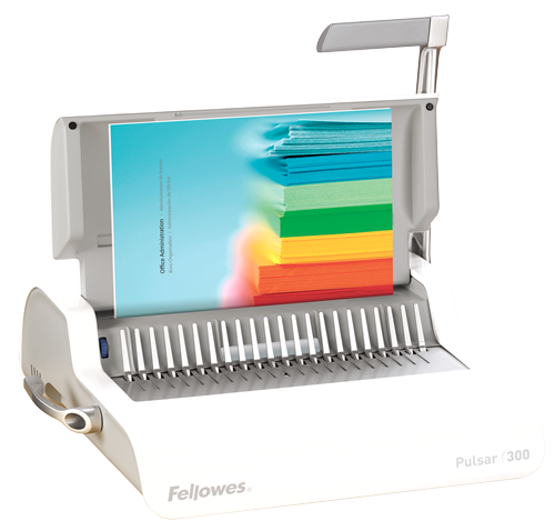 Perforelieuse Fellowes PULSAR 300 manuelle. Capacité de reliure de 300 feuilles avec un anneau de 38 mm pour spirale plastique. Capacité de perforation: 15 feuilles A4